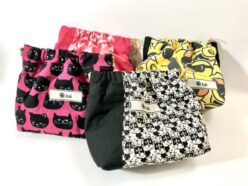 ポシェットにはストラップがついていて、ポーチにはついておらず、巾着は餅です。